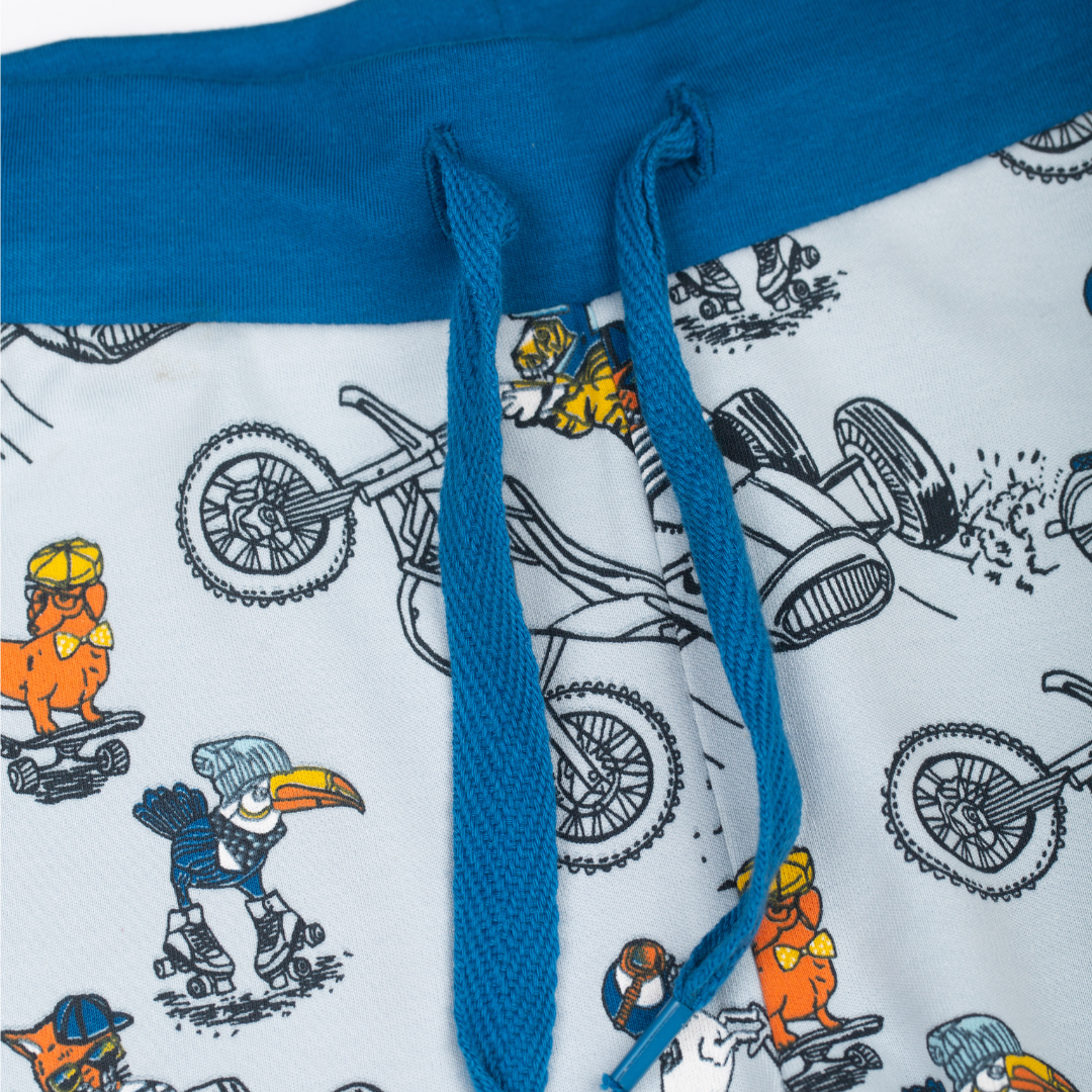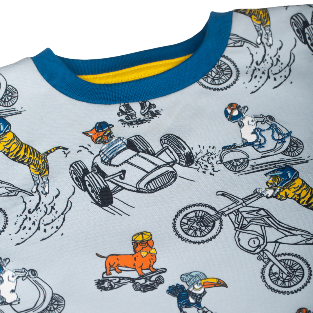 The pyjama top features blue long sleeves with a light blue print featuring animal characters and all their favourite modes of transport.