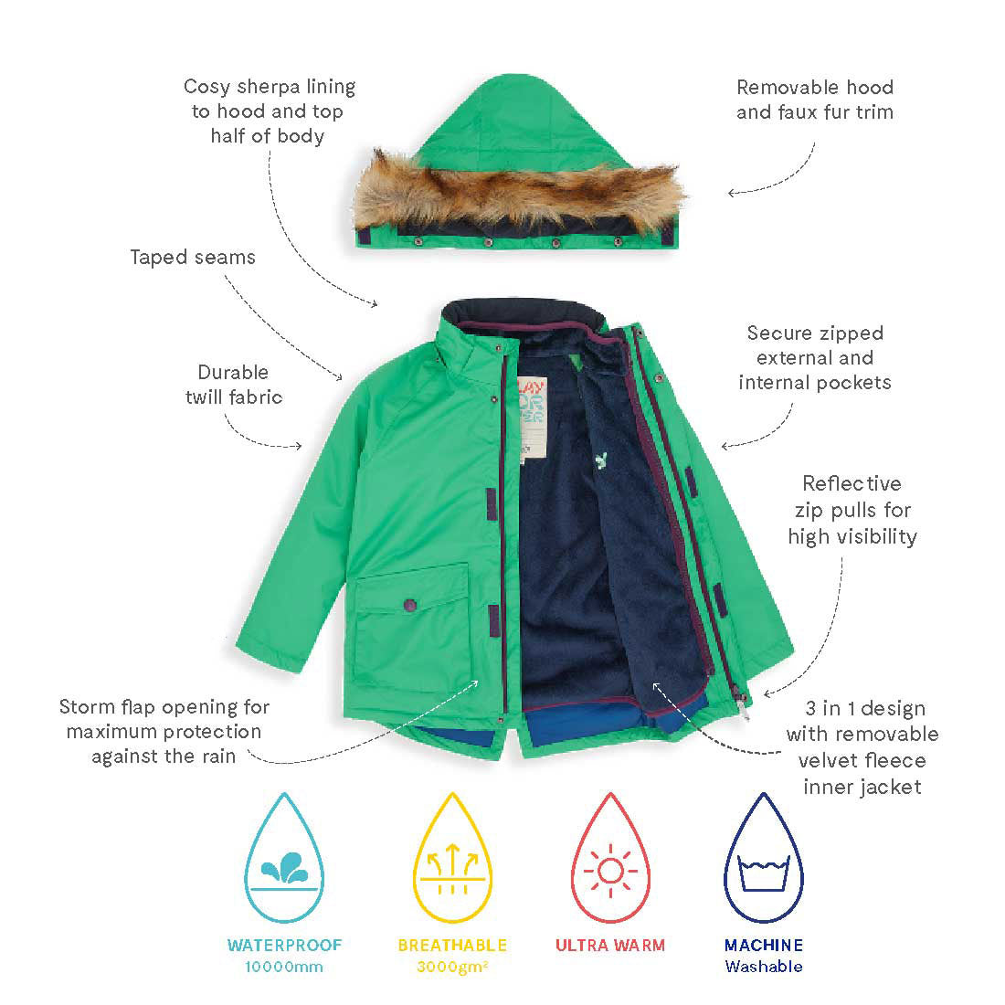 A detachable Sherpa-lined hood and removable faux fur adds even more versatility, reflective details keep your young explorers visible and safe in low lighting and secured internal and external pockets are perfect for collecting treasures. In a fun vibrant green, it's everything you’d want in a kids’ winter jacket!