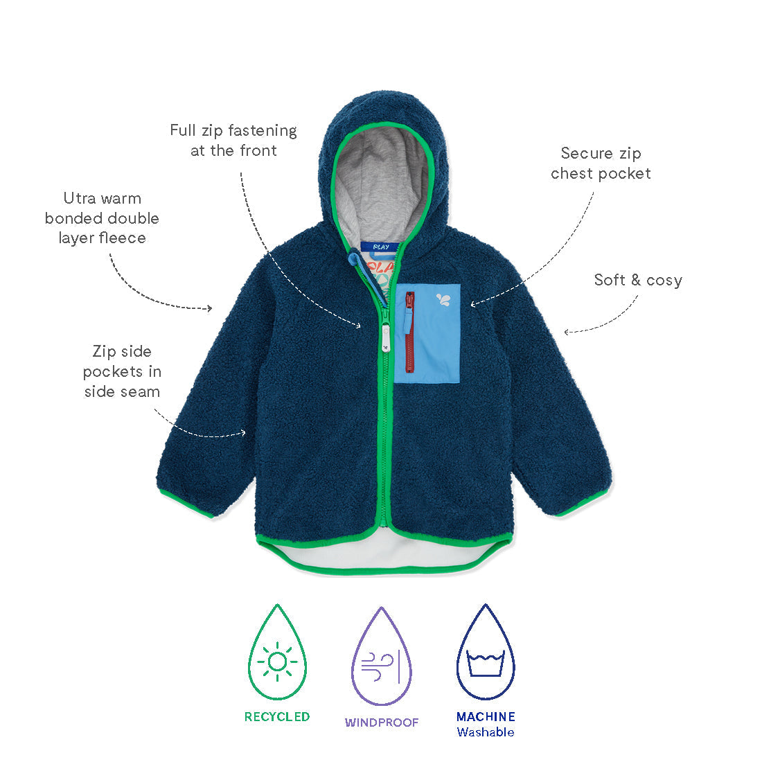 A secure zip chest pocket keeps precious finds safe, while zipped side pockets ensure little hands stay toasty. The full zip front makes it easy to throw it on and off in a hurry and because it’s so irresistibly soft and cosy, young explorers may want to keep on wearing it indoors too!
