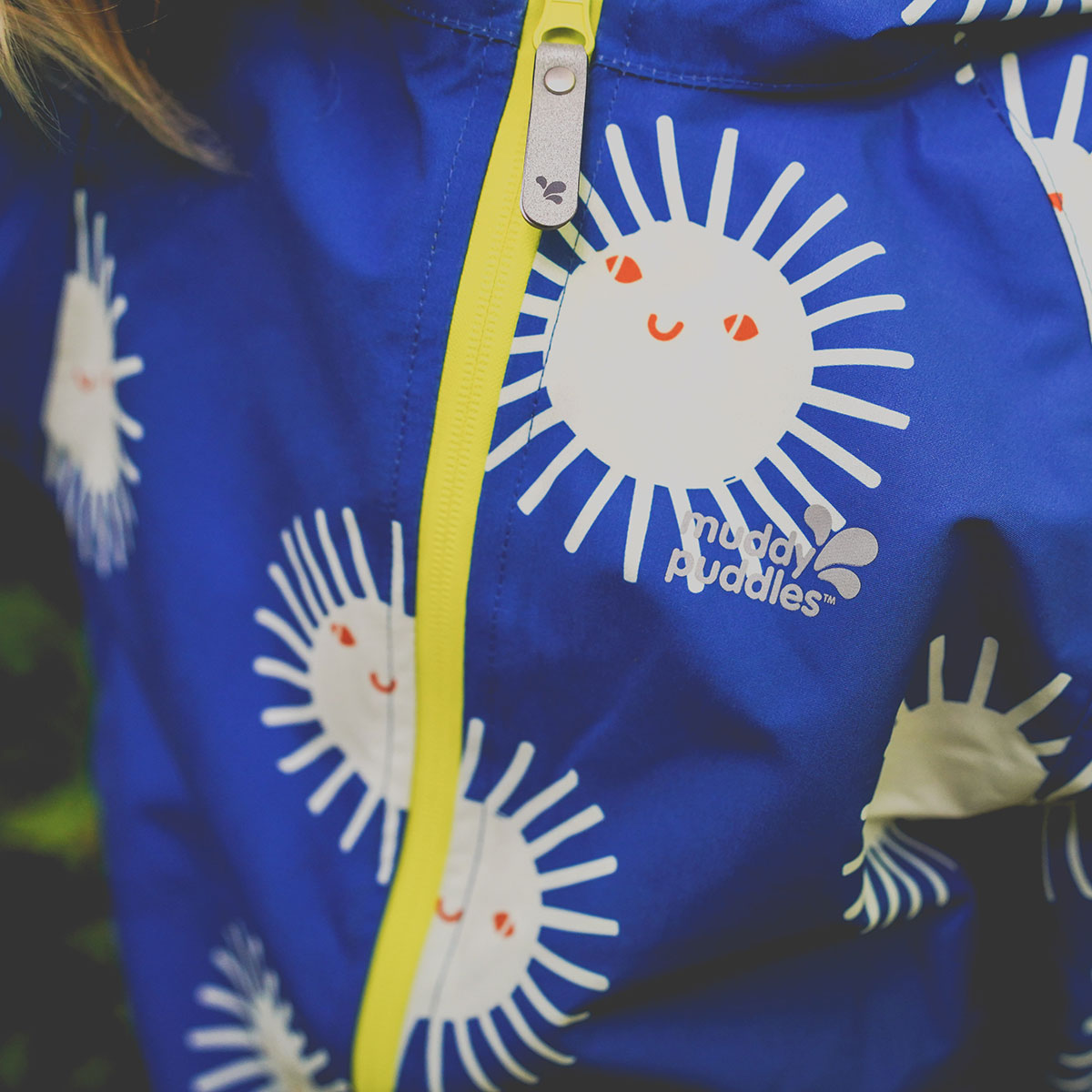 - Kids blue rain jacket with a charming blue smiling sun design and bright green zip.