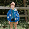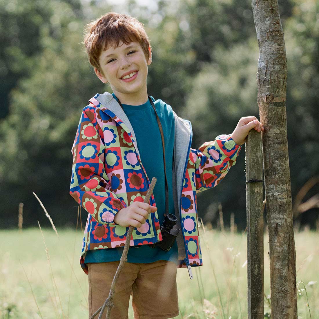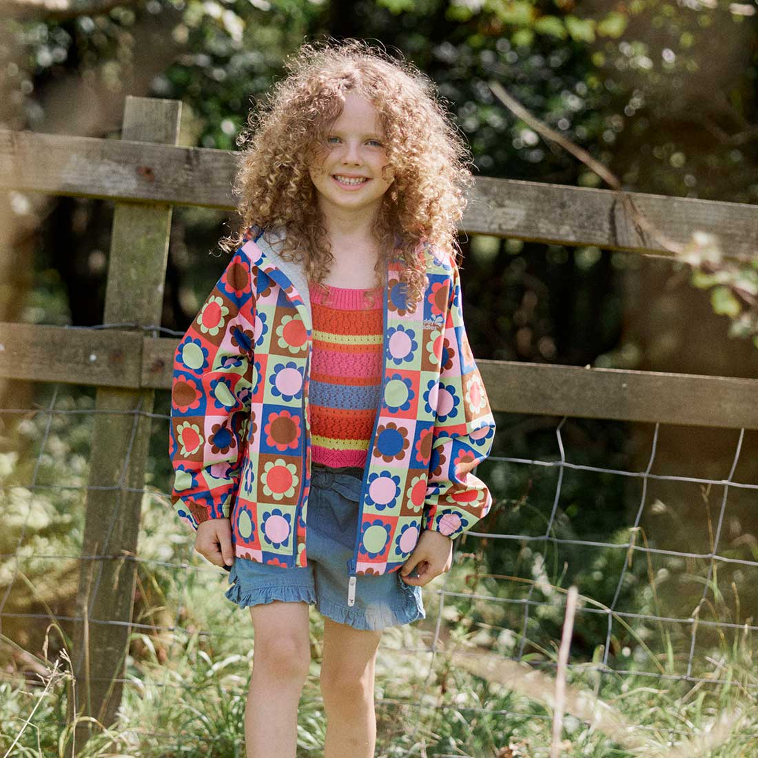 Little ones will love the bright and colourful '70s-inspired print in retro hues of green, red, pink and blue. Perfect for playdates, woodland adventures, and trips to the countryside or coast, whenever the weather is looking dicey.