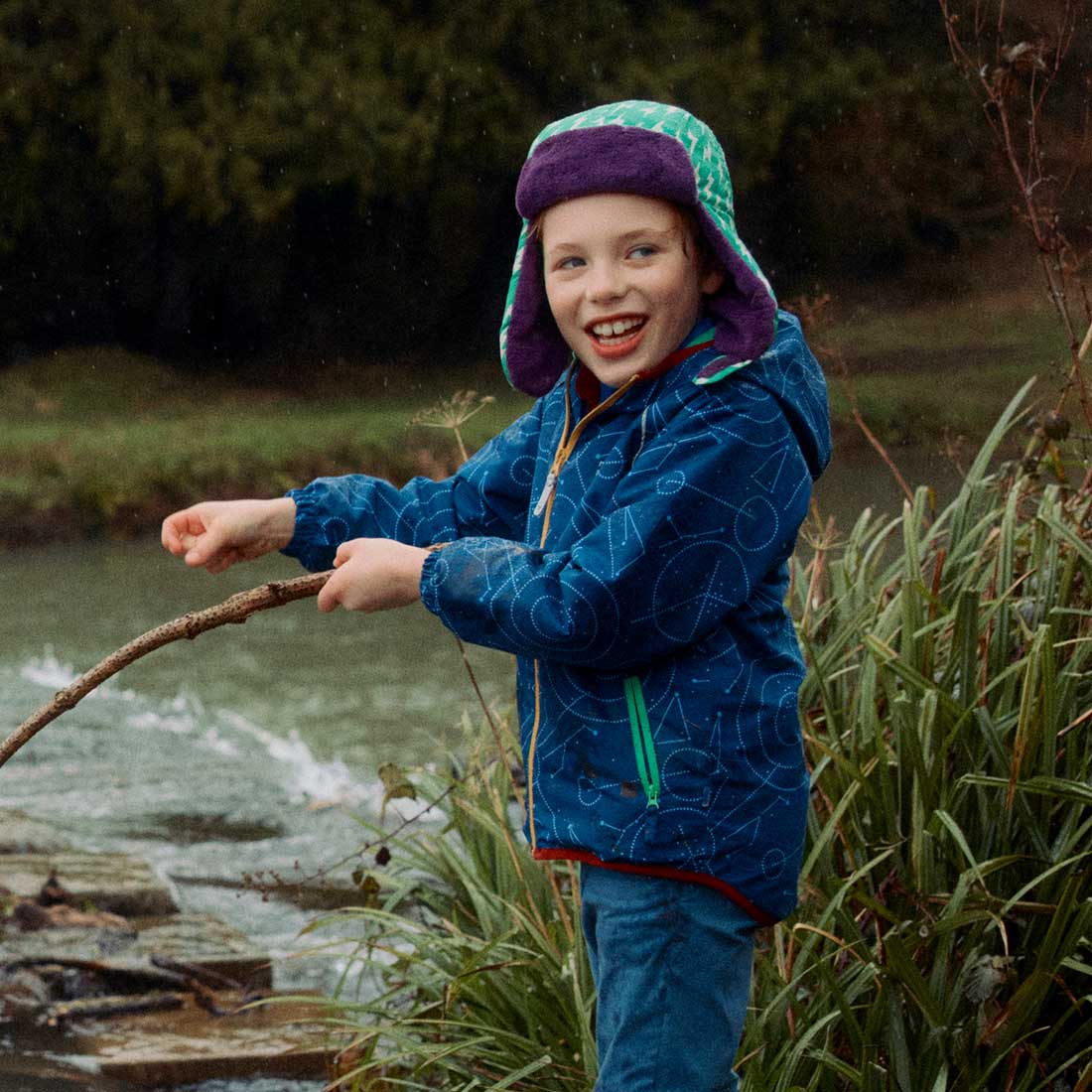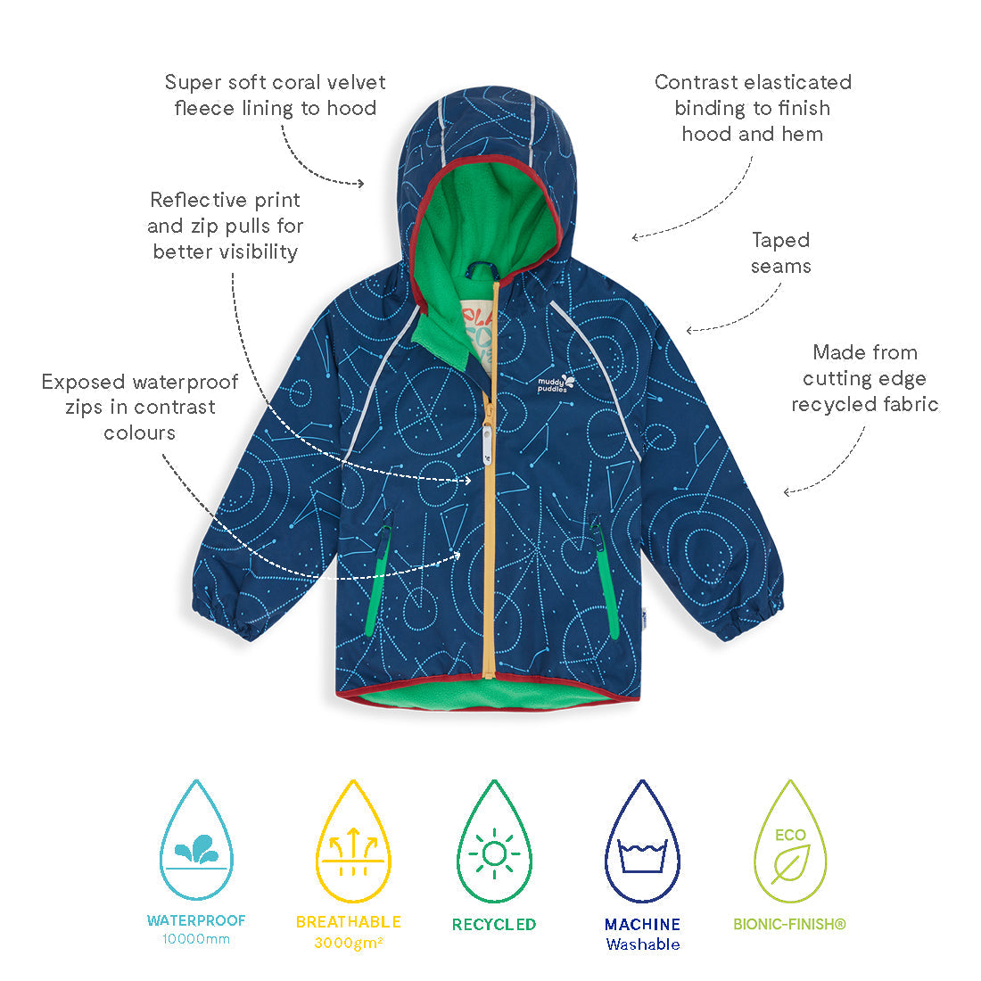 Growing explorers will embark on interstellar adventures with this celestial-themed kids warm waterproof jacket. Crafted from recycled plastic bottles, it’s made from ultra durable and breathable fabric that keeps young stargazers comfortable and dry, whenever the heavens open. Taped seams give this jacket an impressive 10,000mm waterproof rating, while a non-toxic coating that ensures not a single drop sneaks in. The fleece-lined hood and body offer extra warmth, keeping them cosy even on the rainiest days. It also features reflective elements that enhance visibility for safe adventures by twilight. Machine washable for easy care and robust enough for every little astronomer in the making, this waterproof wonder is easy to layer underneath, making it useful for both mild and wintery weather. Adorned with a charming blue constellation print, this eye-catching waterproof fleece lined coat transforms drizzly days into cosmic journeys. Ready for lift-off?