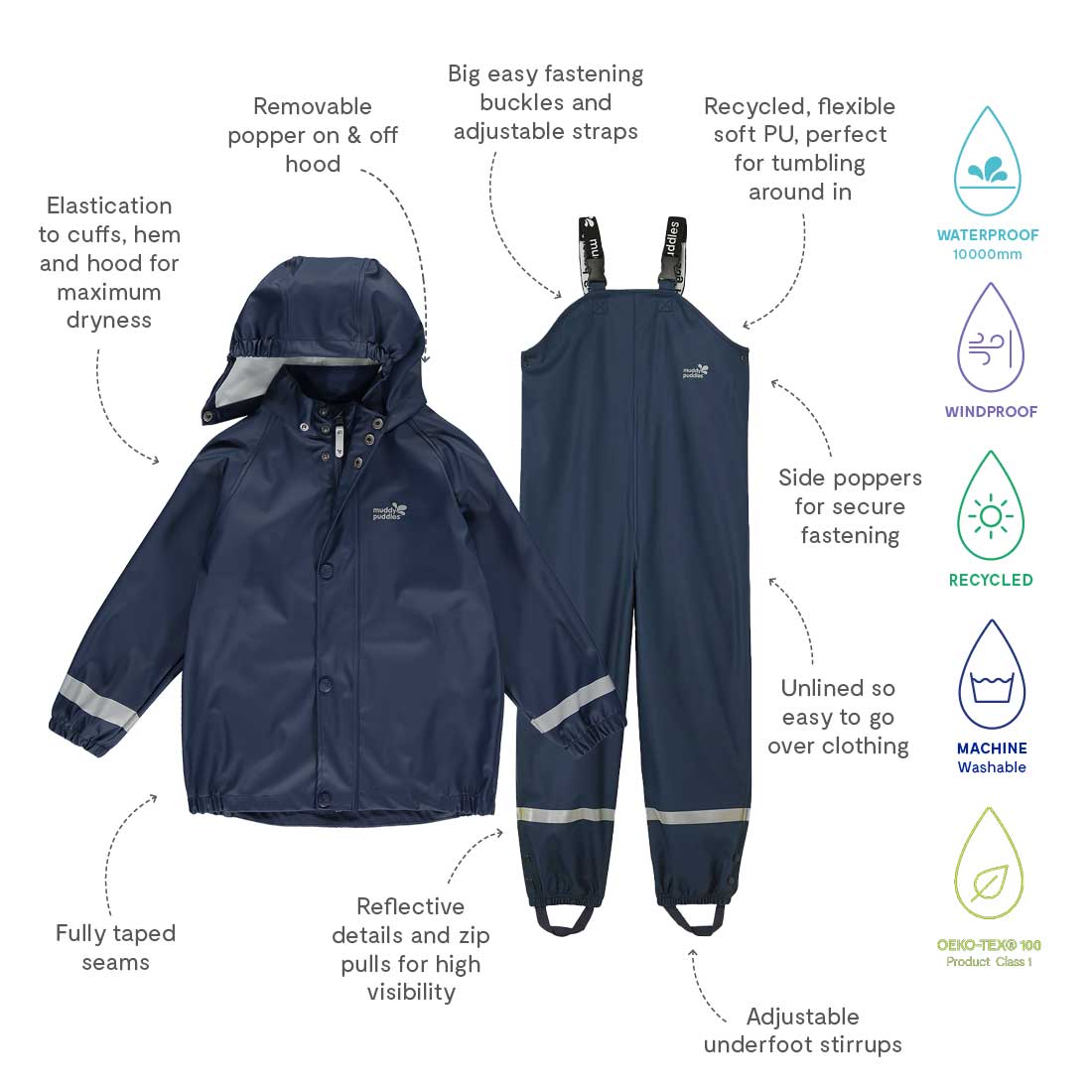 Created from recycled materials, this popular kids navy blue waterproof rain set combines eco-consciousness with exceptional protection.
