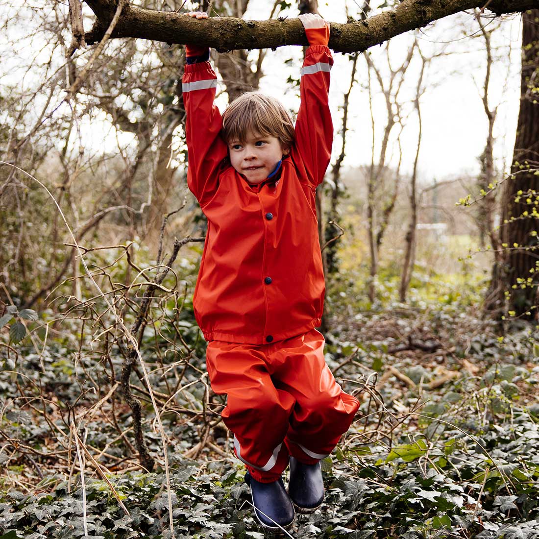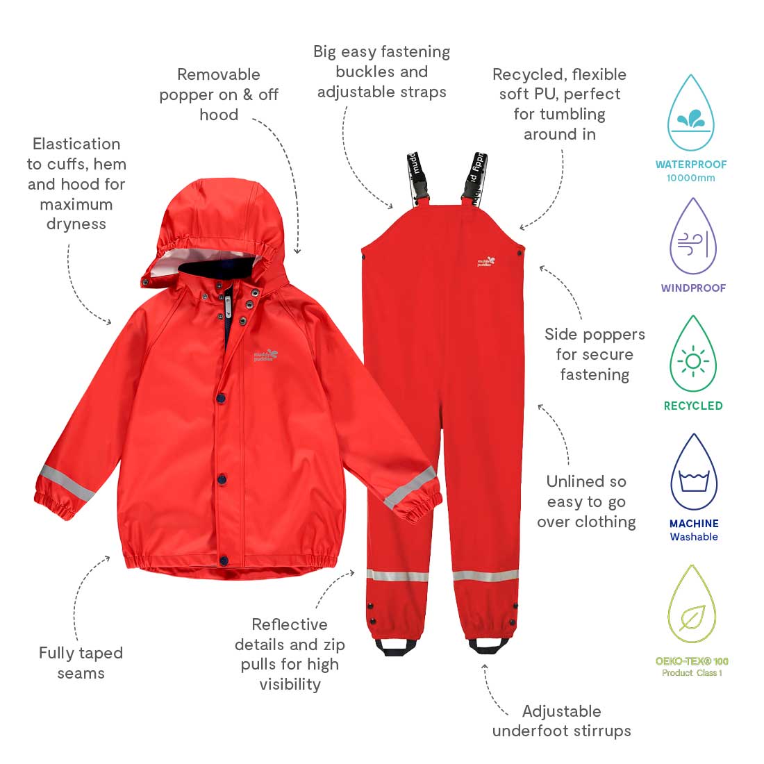 Regular price £65.00Introducing Muddy Puddles kids red waterproof rain set, the Rainy Day Dungaree Set, a must-have for forest school and young nature enthusiasts!