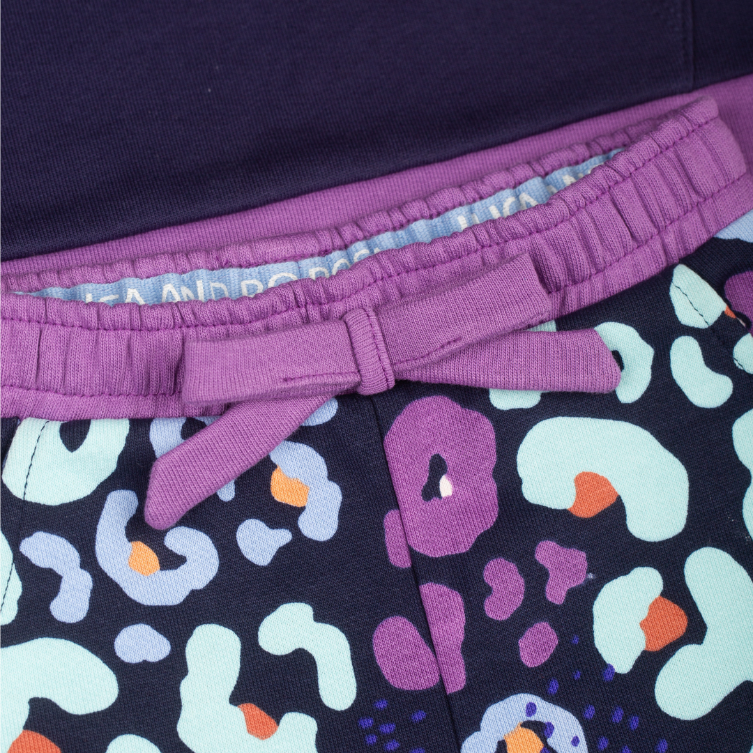 This stylish navy leopard print two-piece matching set includes a long sleeve sweatshirt and a pair of matching joggers that have adjustable drawcords for a comfortable fit.